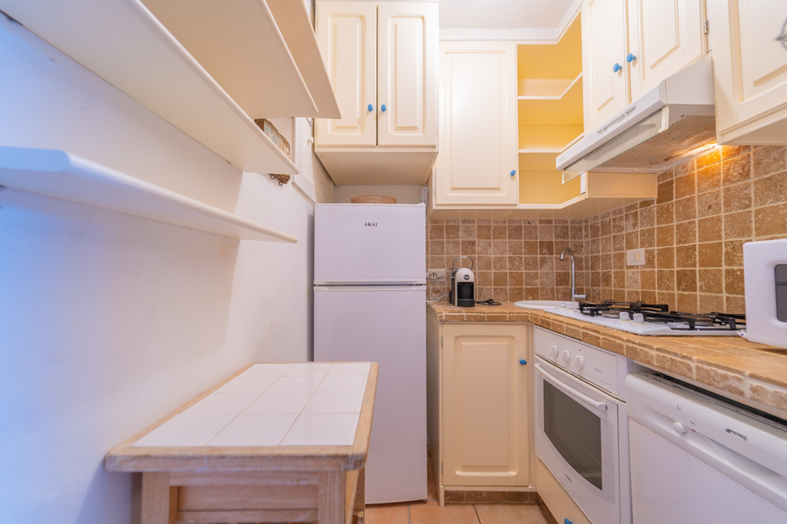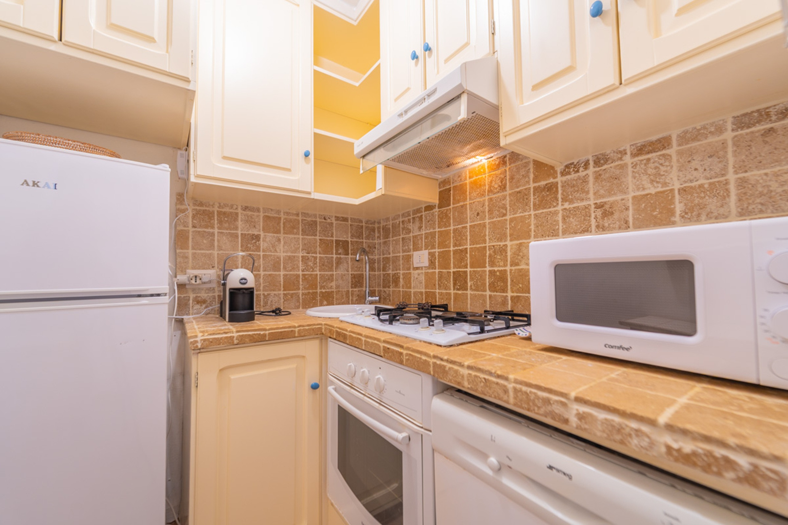 La cucina indipendente, a gas, è attrezzata con frigorifero, microonde, forno, congelatore, lavastoviglie, stoviglie/posate, utensili da cucina, caffettiera, tostapane, bollitore e spremi agrumi.