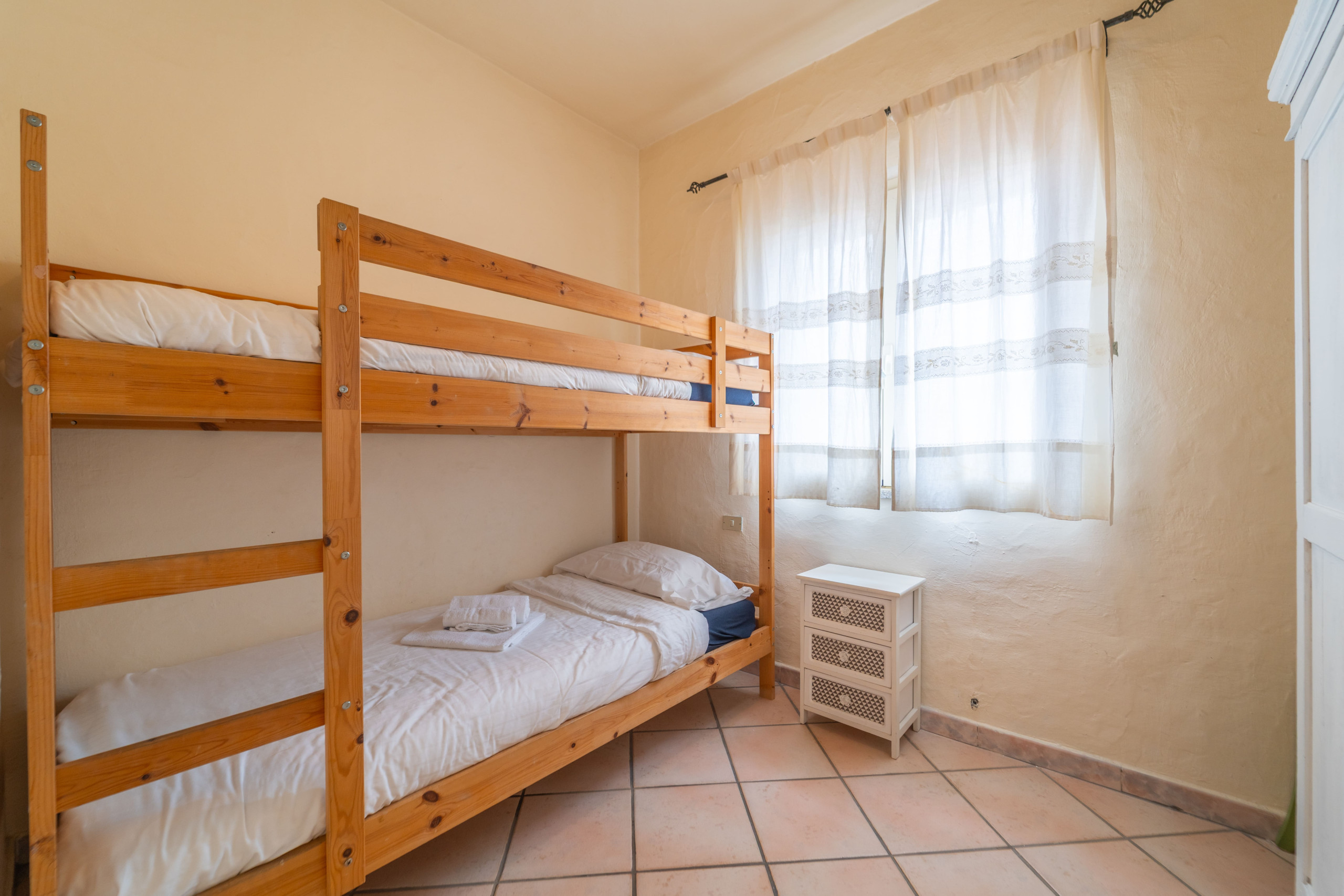 L’appartamento, situato al piano terra, offre una bella veranda vivibile, ideale per colazioni all’aperto o serate in compagnia. All’interno troverete un soggiorno accogliente con un divano letto che può trasformarsi in due letti singoli, un bagno completo con ampia doccia e tutti i servizi igienici, una camera matrimoniale e una doppia con letto a castello, perfetta per famiglie o gruppi di amici.