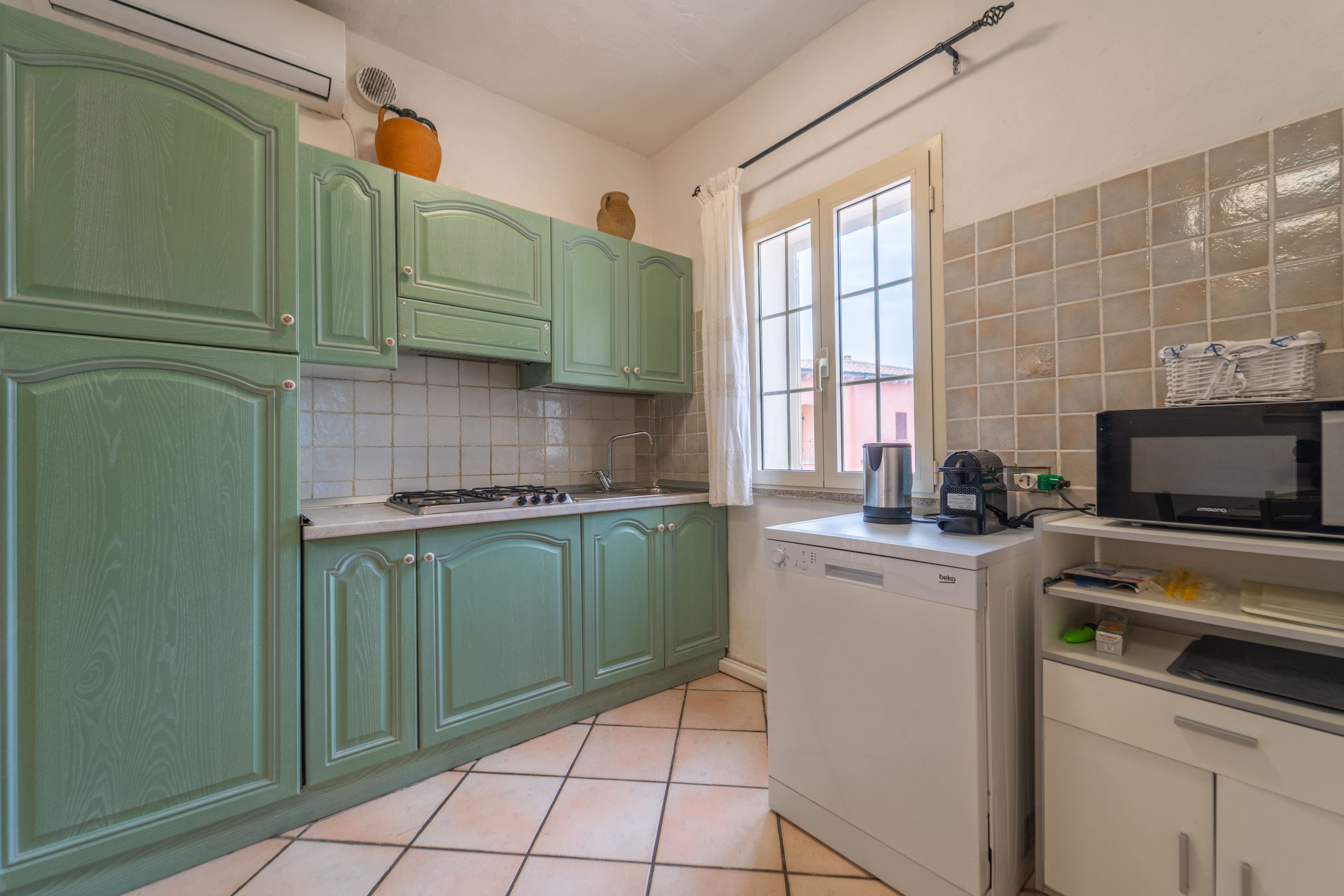 La cucina americana, a gas, è attrezzata con frigorifero, microonde, forno, congelatore, lavastoviglie, stoviglie/posate e utensili da cucina.